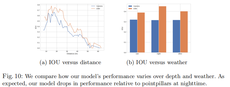 图 10 展示了汽车分割 IOU 随目标距离和天气的变化: