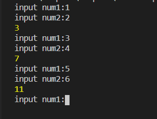 这是一个无线循环的过程,用户输出num1和num2的值后会算出它们相加之和,其运行结果如下: