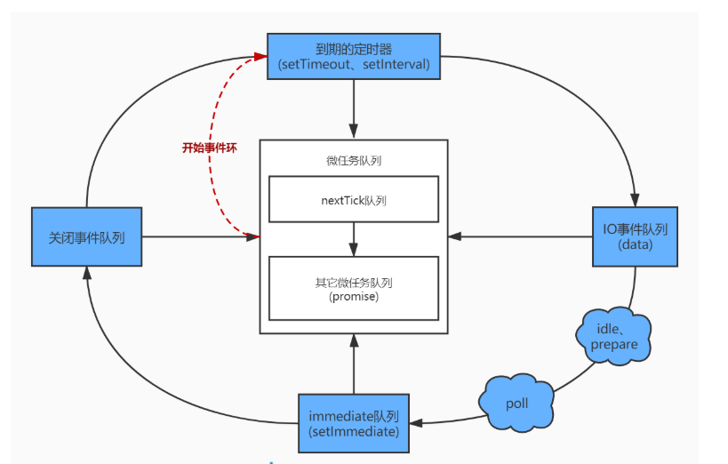 - 执行所有的微任务,先执行nextTick中的所有的任务,再执行其它微任务。