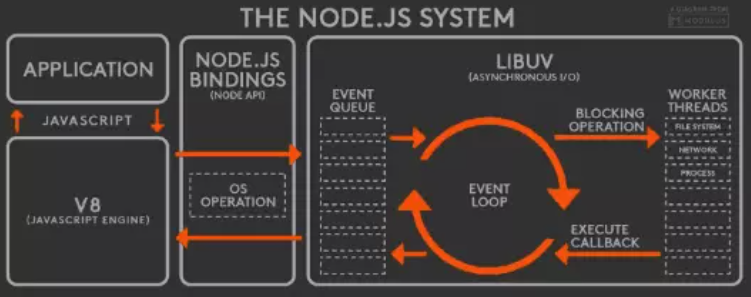 - libuv 库负责 Node API 的执行。它将不同的任务分配给不同的线程,形成一个 Event Loop(事件循环),以异步的方式将任务的执行结果返回给V8引擎。