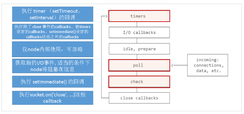 - 开始执行宏任务,共有6个阶段,从第1个阶段开始,会执行每一个阶段所有的宏任务。