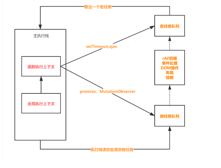 requestAnimationFrame回调、事件处理以及刷新页面。 - 取出一个宏任务放入主执行栈中执行,然后按此步骤如此循环。
