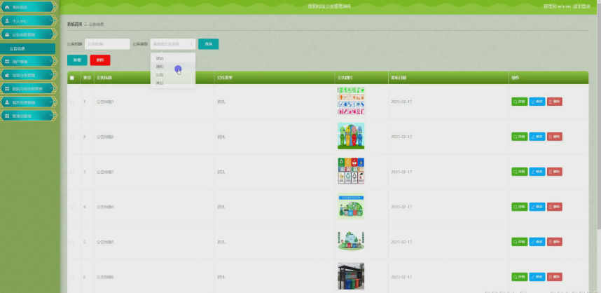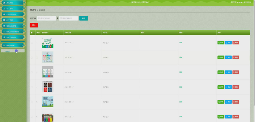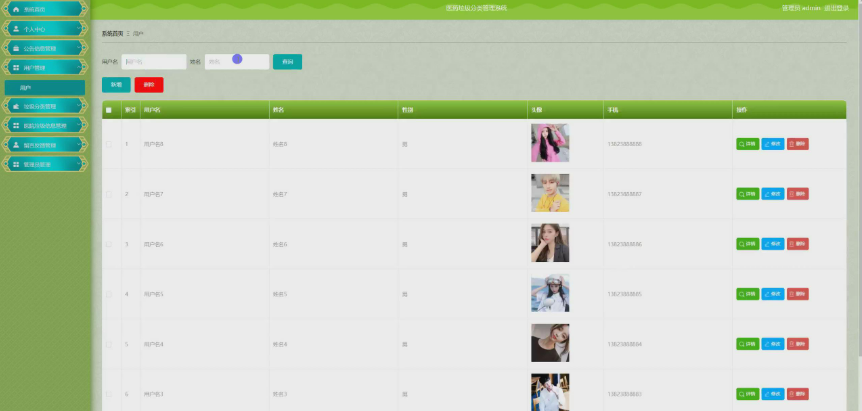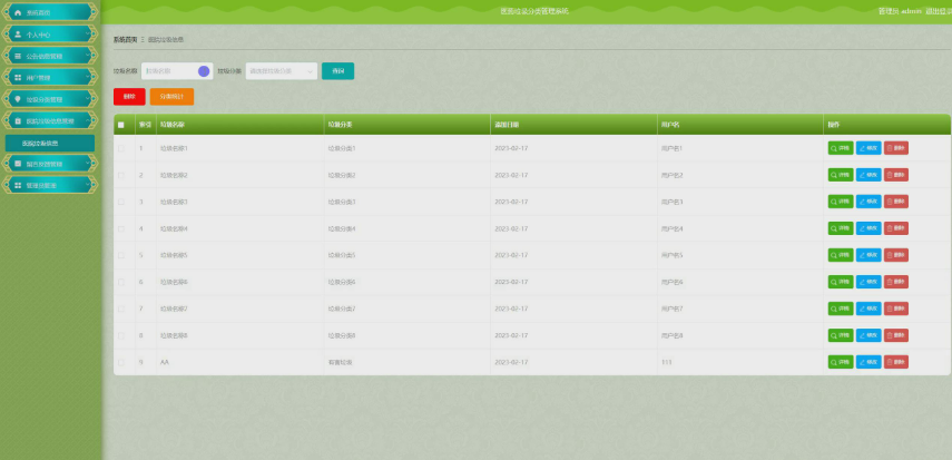 管理员登入使用本系统涉到的功能主要有个人中心、公告信息管理、用户管理、垃圾分类管理、医院垃圾信息管理、留言反馈管理、管理员管理等功能。