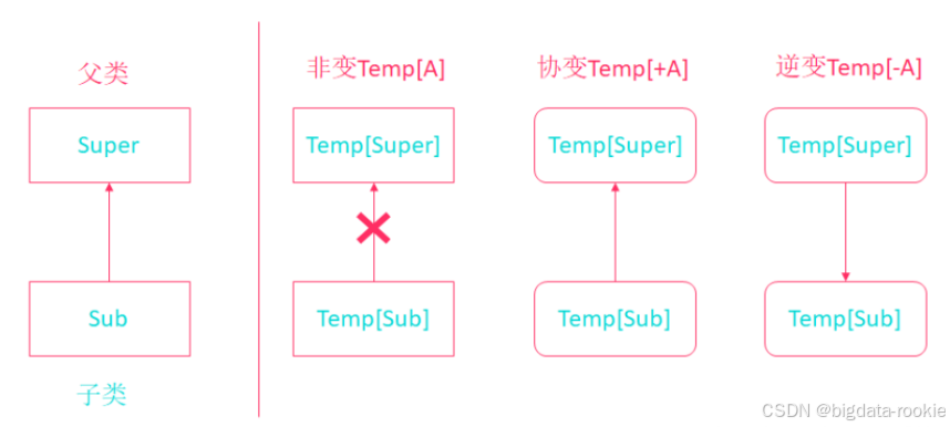 - 非变:A 类和 B 类是父子类关系,但是 Pair[A] 和 Pair[B] 之间没有任何关系;