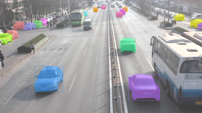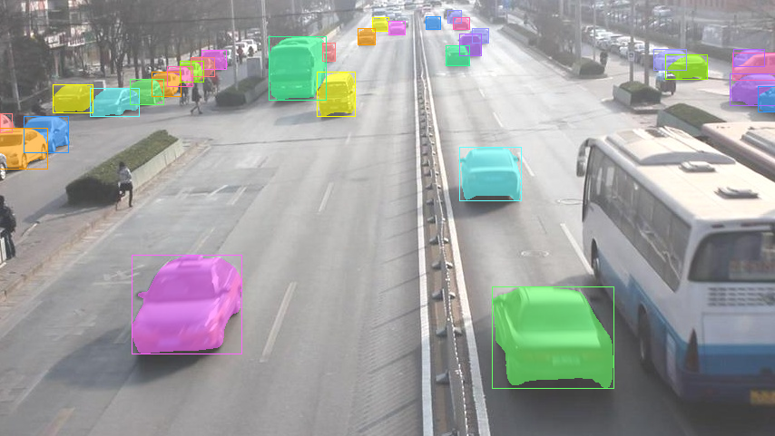可以发现,通过多添加一个提示框,能够检测出更多的目标,例如左侧和右侧较小的车辆比之前多分割出了一些。但是由于遮挡原因,还是有一些车辆并没有检测出来。
