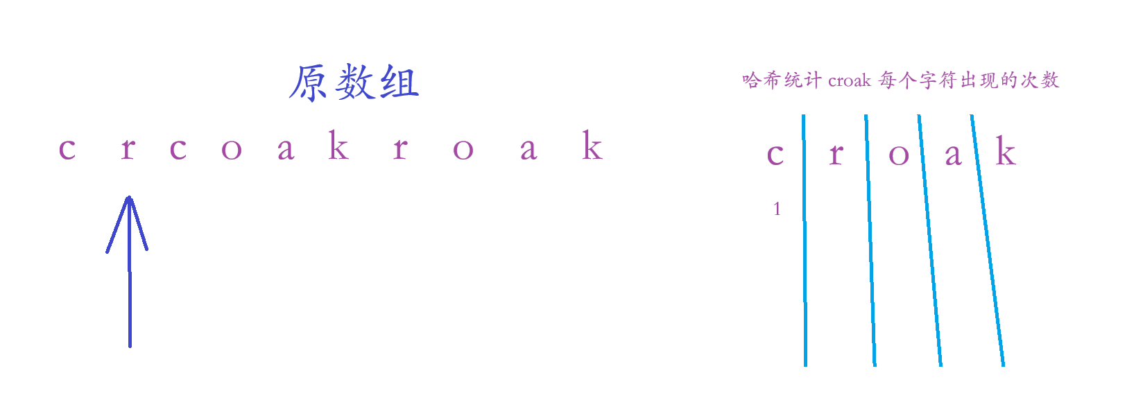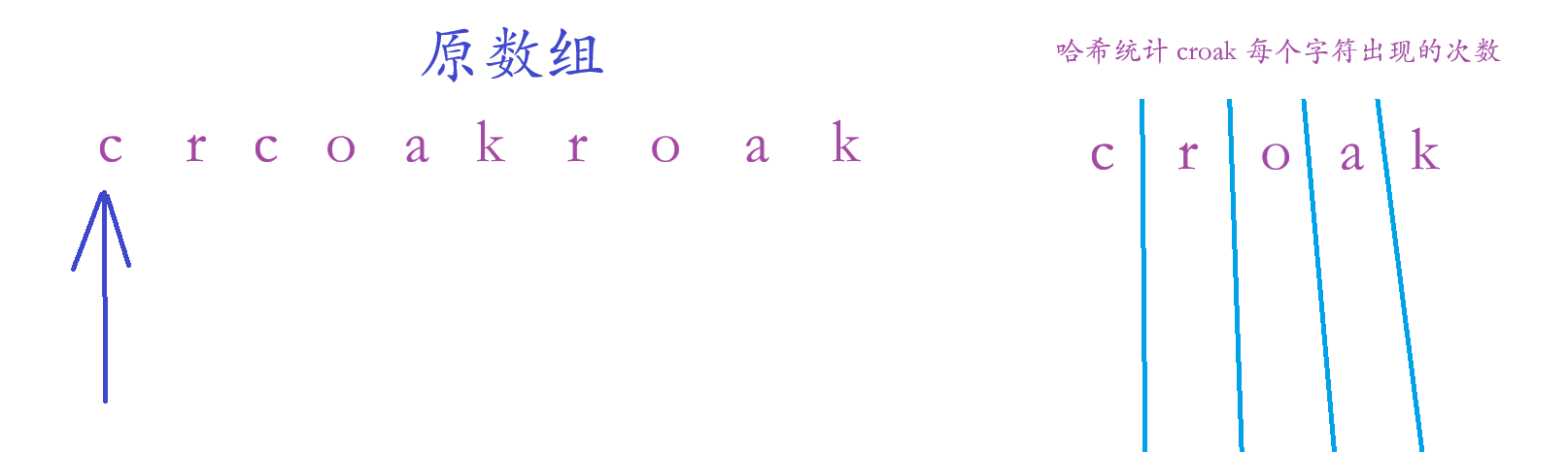 我们用一个哈希表来统计 croak 每个字符出现的次数,我们重头开始遍历原数组,我们先聊一下除了遍历到字符 "c" 的情况: