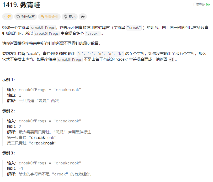 一套操作下来,哈希表的情况应该是 "k" 有次数,而其他的字符都为0,如果其他的字符不为0,这代表着有青蛙没有完整的叫出来,此时返回 -1.