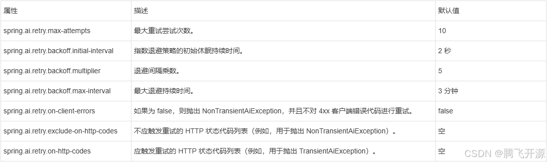 前缀 spring.ai.retry 用作属性前缀,允许您为 OpenAI 聊天模型配置重试机制。