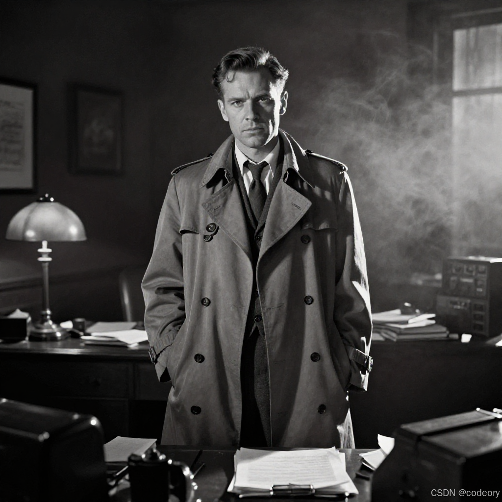 提示词: 一位 1940 年代黑色电影侦探,身穿风衣,站在烟雾弥漫、光线昏暗、杂乱无章的办公室里。强烈、戏剧性的明暗对比照明,高对比度,黑白画面,用复古 35mm 胶片拍摄。**Z-Image** 风格遵循。