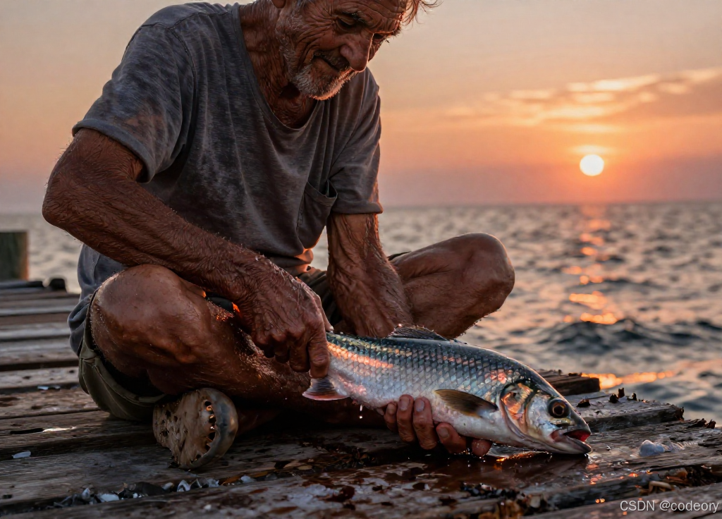 提示词: 一张超细致的照片,描绘一位皮肤饱经日晒、布满皱纹的老渔夫,在日落时分坐在破旧的木码头上。他正抓着一条刚捕到的鱼,鱼鳞在橙色阳光下反射出令人难以置信的细节。电影感的轮廓光,深阴影,8K,用徕卡 M10 拍摄。 --ar 16:9