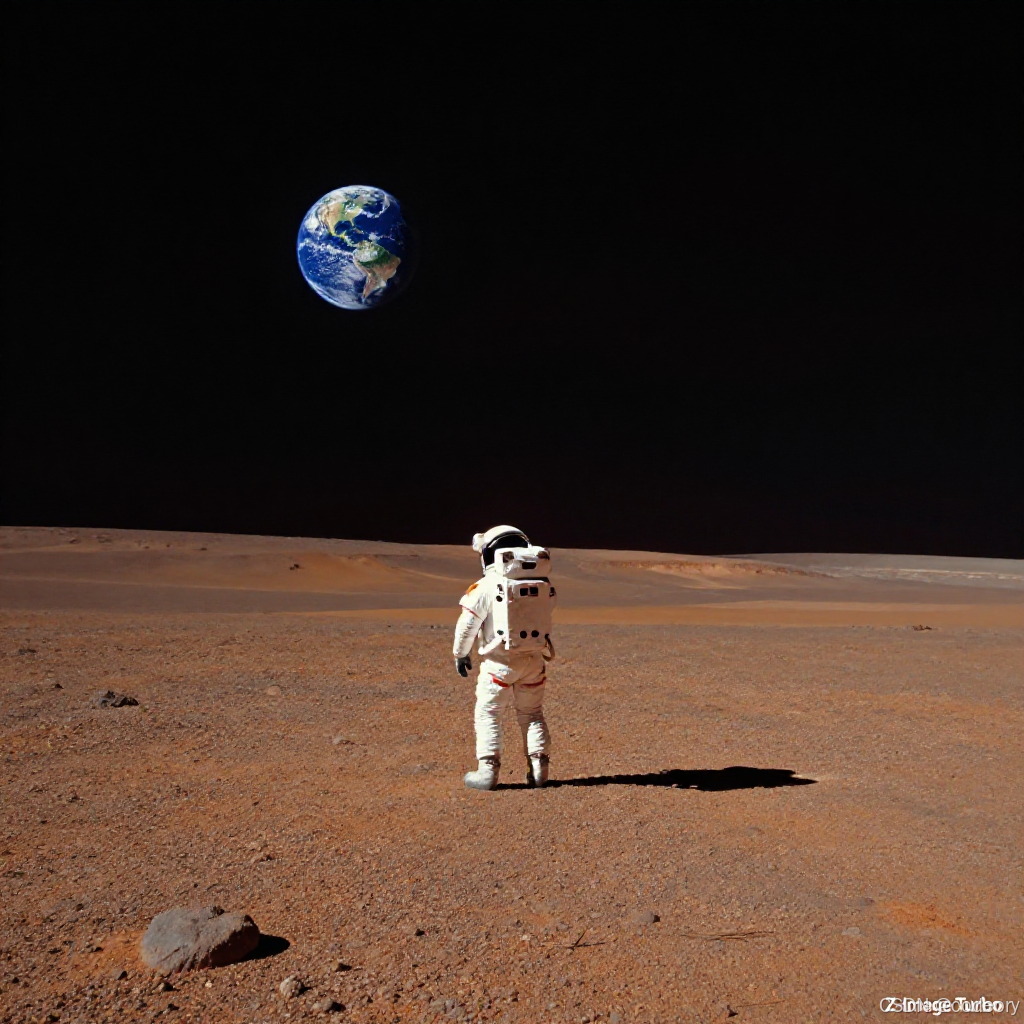 提示词: 一名孤独的宇航员站在火星崎岖的表面,仰望黑色天空中可见的地球。广角镜头,照片级真实感,电影构图,**Z-Image Turbo** 速度测试。 --steps 4