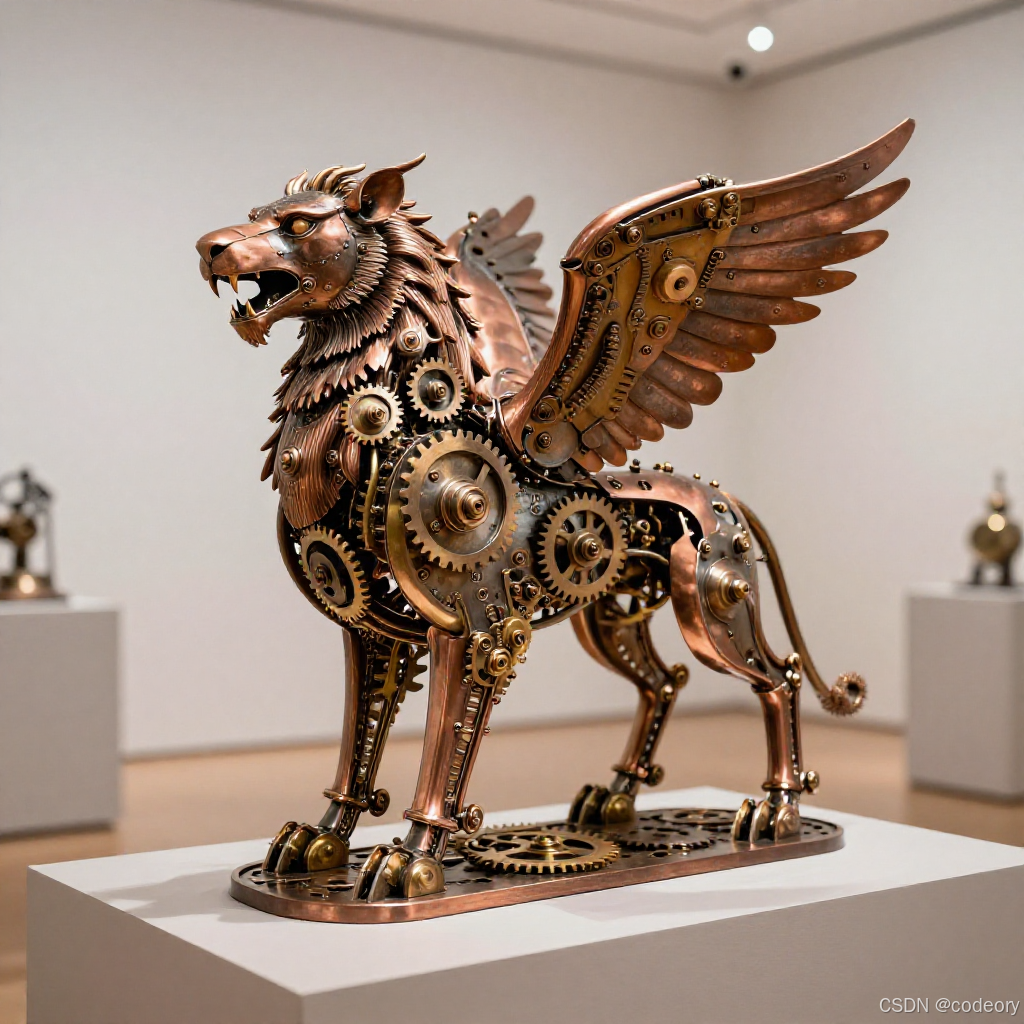 提示词: 一件奇幻、高度细致的雕塑,描绘一头神话野兽------部分是狮鹫,部分是发条机械------完全由抛光的青铜齿轮、黄铜管和回收的钟表零件构成。陈列在极简主义基座上,背景是一个线条鲜明、光线明亮的画廊。蒸汽朋克美学,**Z-Image** 微细节。