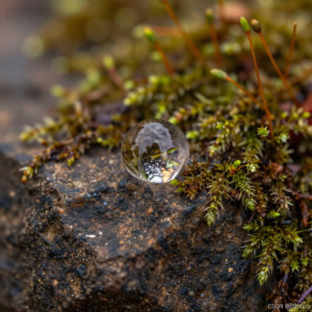 提示词: 一颗完美的晨露珠躺在覆盖着厚厚苔藓的石头上,极限特写微距拍摄。极浅景深,自然柔光箱照明,展示苔藓的质感和水珠中反射的阳光。难以置信的细致 **Z-Image** 渲染。