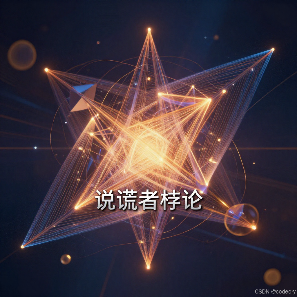 提示词: 一个复杂算法解决"说谎者悖论"的可视化呈现。抽象数字艺术,发光的几何形态,交织的光径,深蓝、金色和橙色的配色,厚重的体积光,Octane 渲染,**Z-Image** 概念保真度。