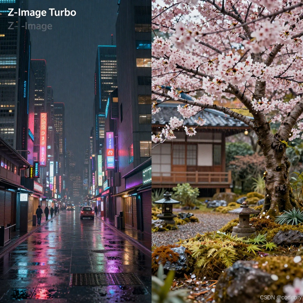 提示词: 一张分割画面构图:左侧是夜间密集、雨水浸湿、霓虹倒影复杂的赛博朋克城市景观;右侧是一个宁静、阳光普照的日式禅意花园,一棵樱花树正繁花盛开。分界线清晰而干净。错综复杂的细节,**Z-Image Turbo** 真实感,**Z-Image** 提示词遵循测试。
