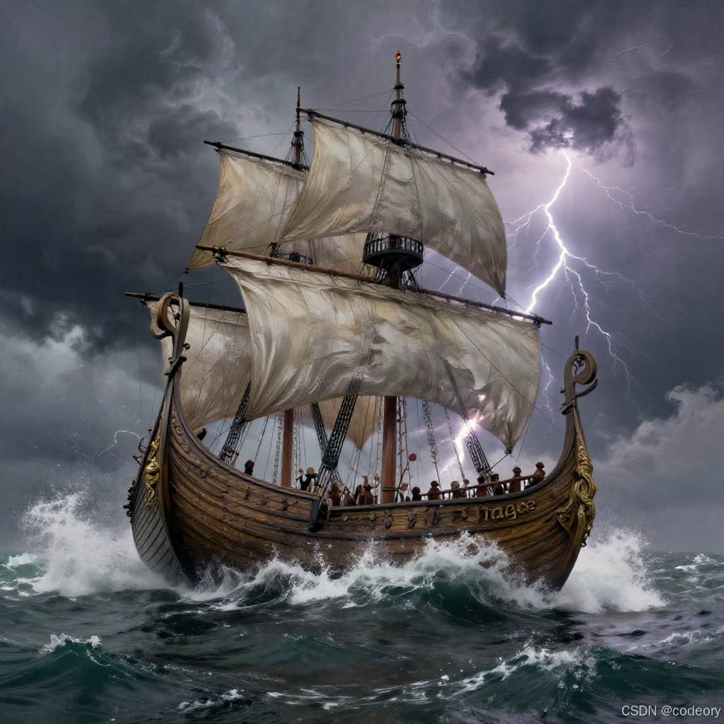 提示词: 一艘巨大的维京长船在波涛汹涌的深绿色海面上与一场可怕的巨型风暴搏斗。动态的水花和泡沫效果,天空中的闪电,低角度拍摄,史诗级规模,电影遮罩绘画,**Z-Image** 环境细节。