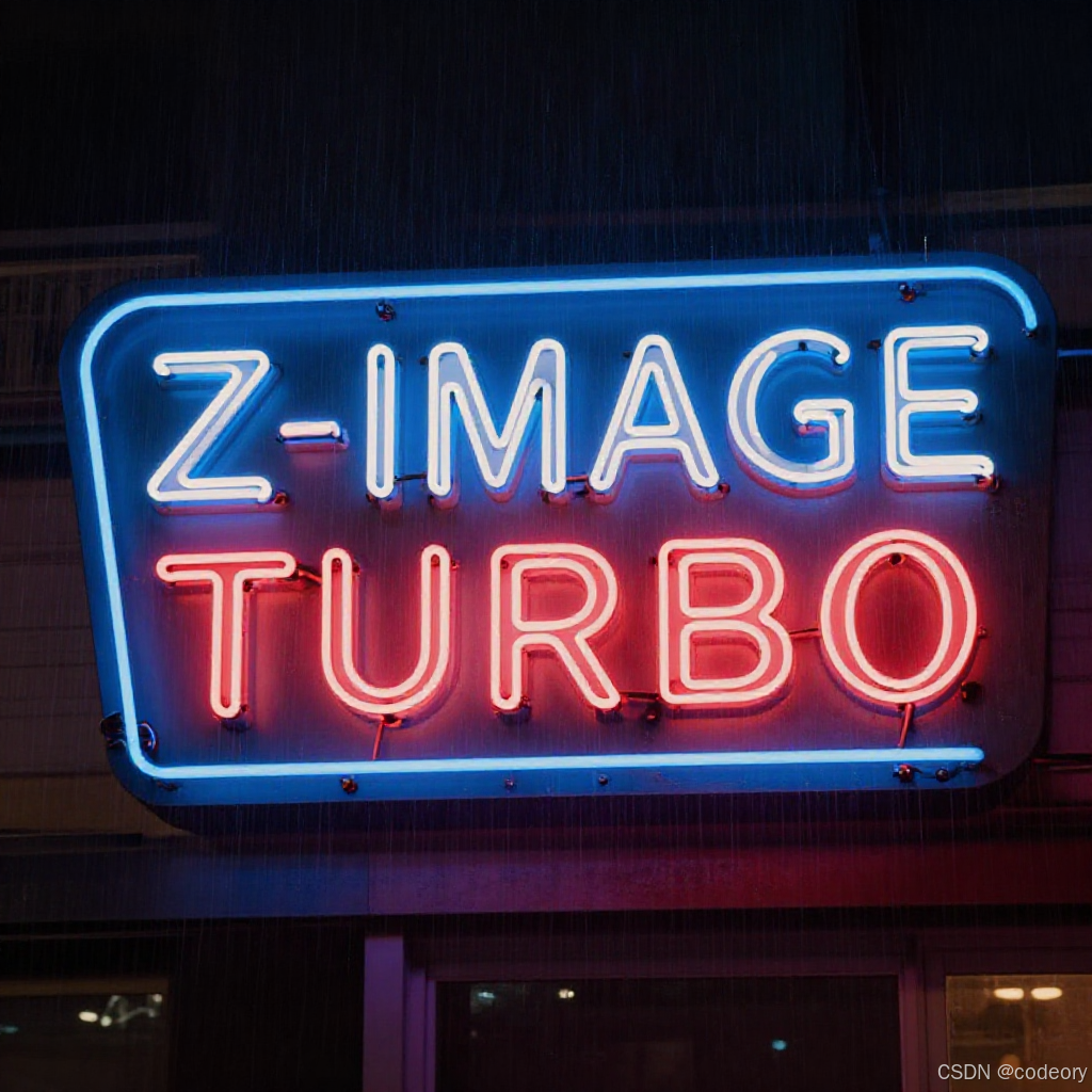 提示词: 一个复古风格的霓虹灯招牌,散发着电光蓝和深红色的光芒,清晰正确地显示"Z-IMAGE TURBO"字样,采用复古未来主义字体。雨夜的街道背景,聚焦的光源,8K 细节,**Z-Image** 文字理解。