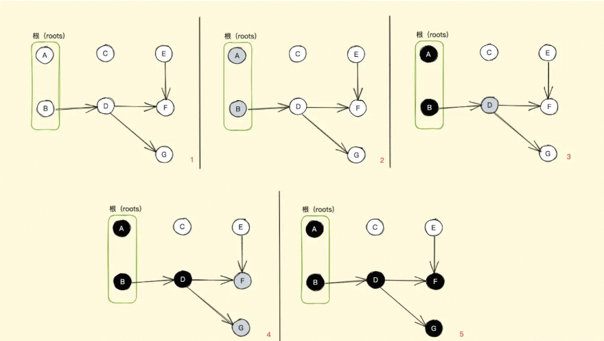 标记:从根(全局变量、当前函数的局部作用域开始)标记"可达对象"为活跃对象