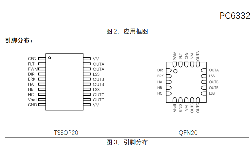 PC6332 是一款宽工作电压,大电流,高集成度的三相 BLDC 驱动芯片。包括三个半桥,换向逻辑, PWM 调速与方向控制,以及包括限流,短路,过温,欠压,过压,堵转等完善的保护功能。PC6332 的智能开路保护逻辑可以侦测出电机端子开路,虚焊等异常故障。当异常发生后, FLT 引脚将拉低报警。精简的外部电路,适合各类永磁同步电机的驱动。封装形式为带散热焊盘的TSSOP20,或 QFN20。