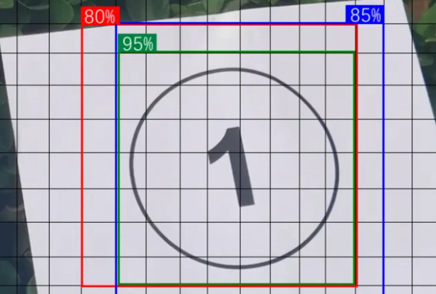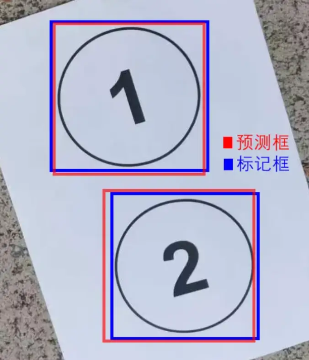 如果预测出的面积(蓝框)能占到实际区域(红框)的50%以上,那么我们就说IoU为50。重合度能到50%,其实能说明AI大体猜中了。因为IoU为100就是完全重合。