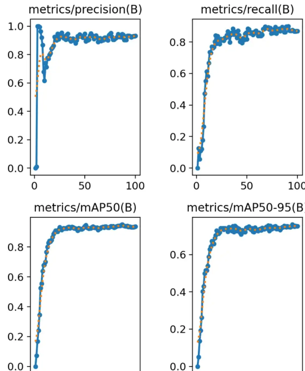 我们看到loss的值都是降低,这说明很好。但是第一个box_loss好像还有下降的趋势。但是中间的cls_loss在50轮时就已经趋于稳定了,而dfl_loss好像在75轮附近才慢慢稳定。
