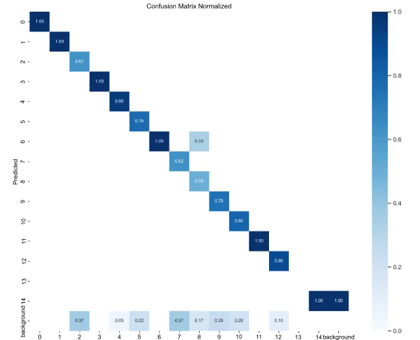 下面是是混淆矩阵的归一化版本,对应的图片是confusion_matrix_normalized.png。这里可以更清晰地展示模型在各类别上的性能表现。我们也可以看到第13类别数据为空。