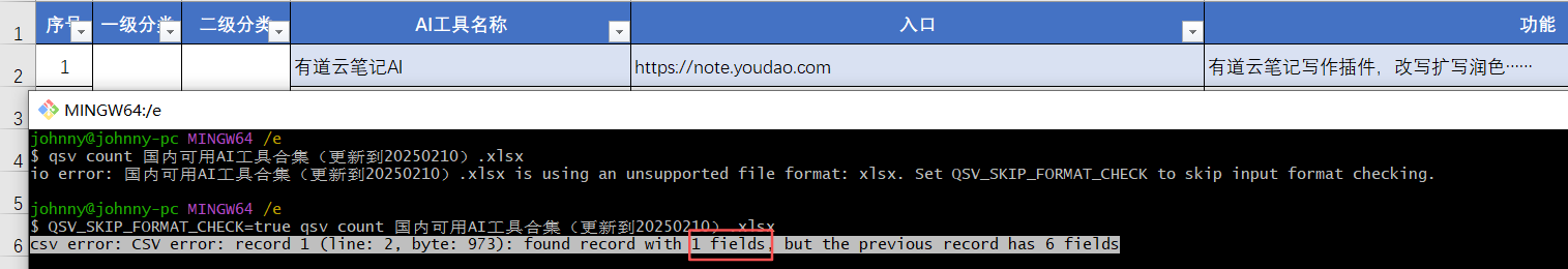 qsv count data.csv用于统计行数。qsv Pro版本提供图形化的操作界面,适合非技术人员; - 工作流管道:可将多个命令或者操作系统命令组合使用,构建复杂的数据处理流程。例如,命令