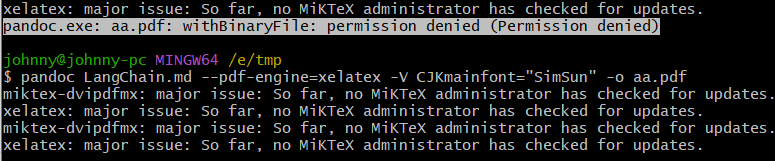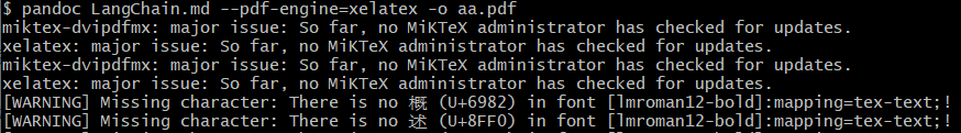重试命令pandoc LangChain.md --pdf-engine=xelatex -V CJKmainfont="SimSun" -o aa.pdf,终于成功: