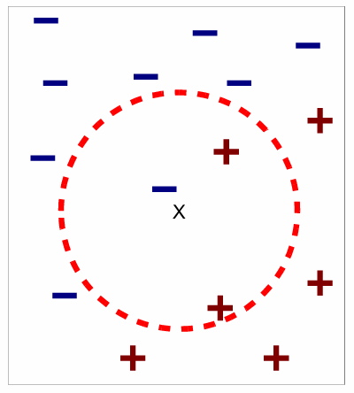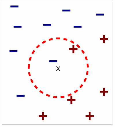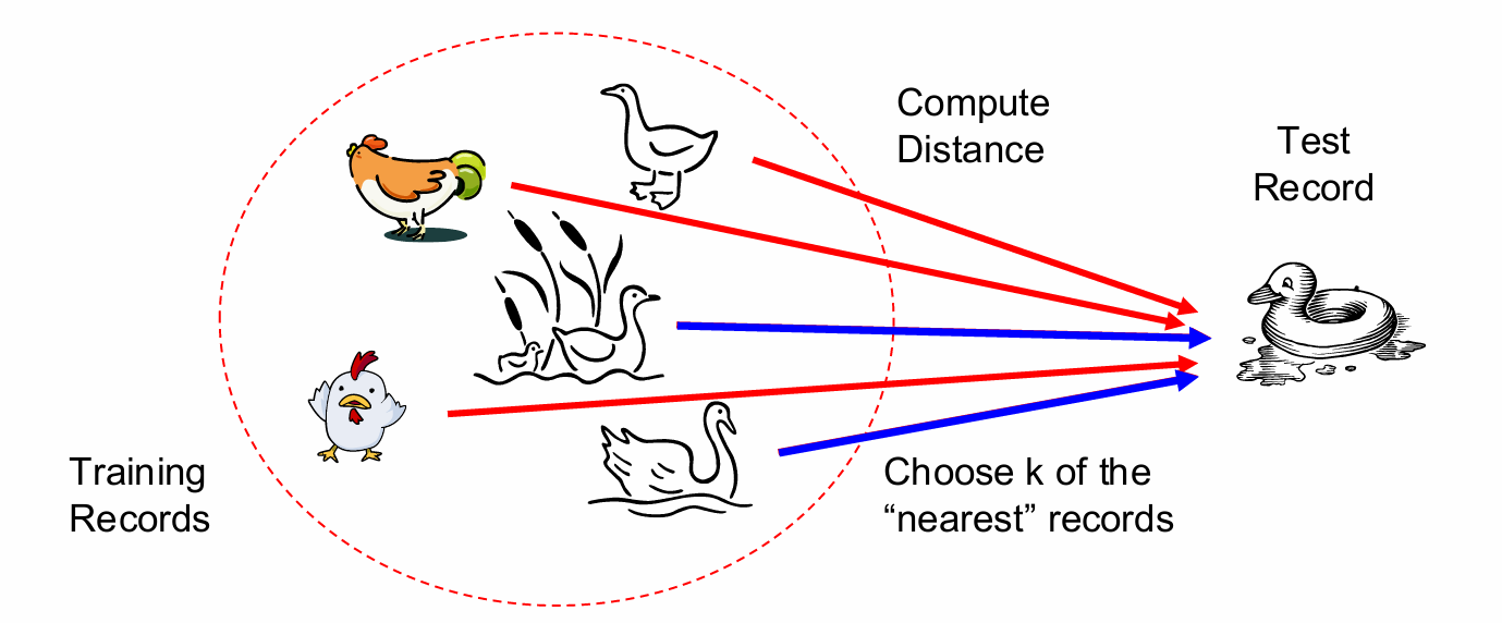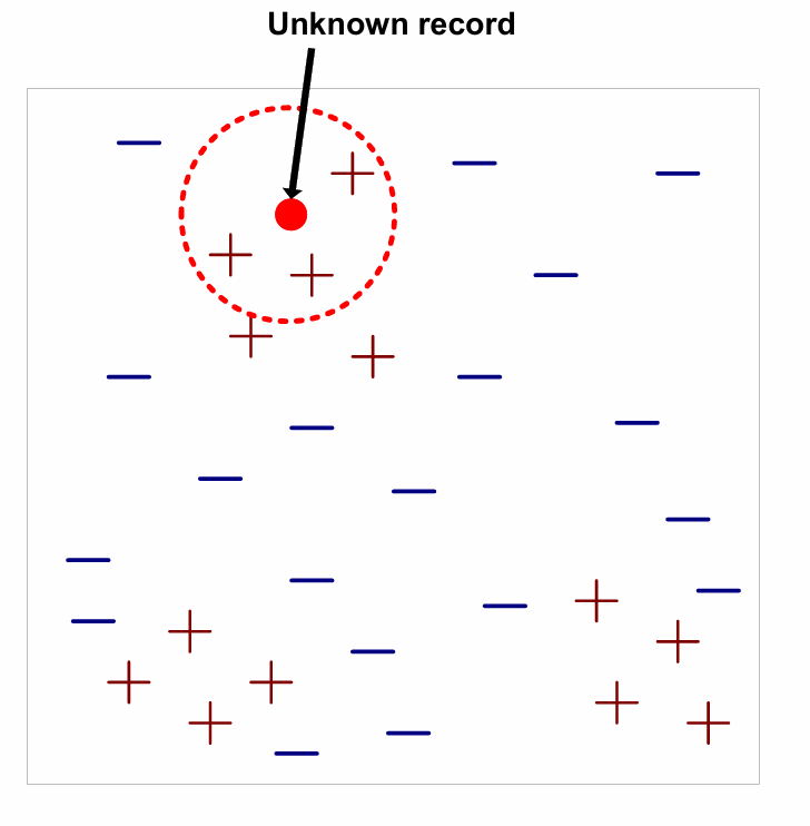 - 使用最近邻居的类别标签确定未知记录的类别标签(Use class labels of nearest neighbors to determine the class label of unknown record):通过某种方法(例如多数投票)来确定未知记录的类别标签。
