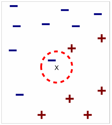 如图所示,根据最近邻的三个的类别标签进行投票,那这个点就是正类。