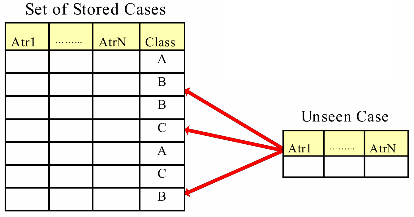 基于实例的分类器是一种机器学习方法,它通过存储训练数据集(即"已存储的案例")来对新的、未见过的数据(即"未见过的案例")进行分类。