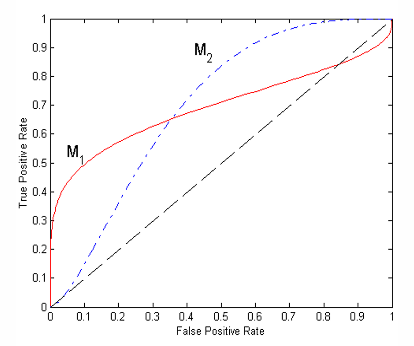 没有模型在所有情况下都优于另一个模型。对于较小的假正例率(FPR),模型 M 1 M_1 M1表现更好。对于较大的假正例率(FPR),模型 M 2 M_2 M2表现更好。