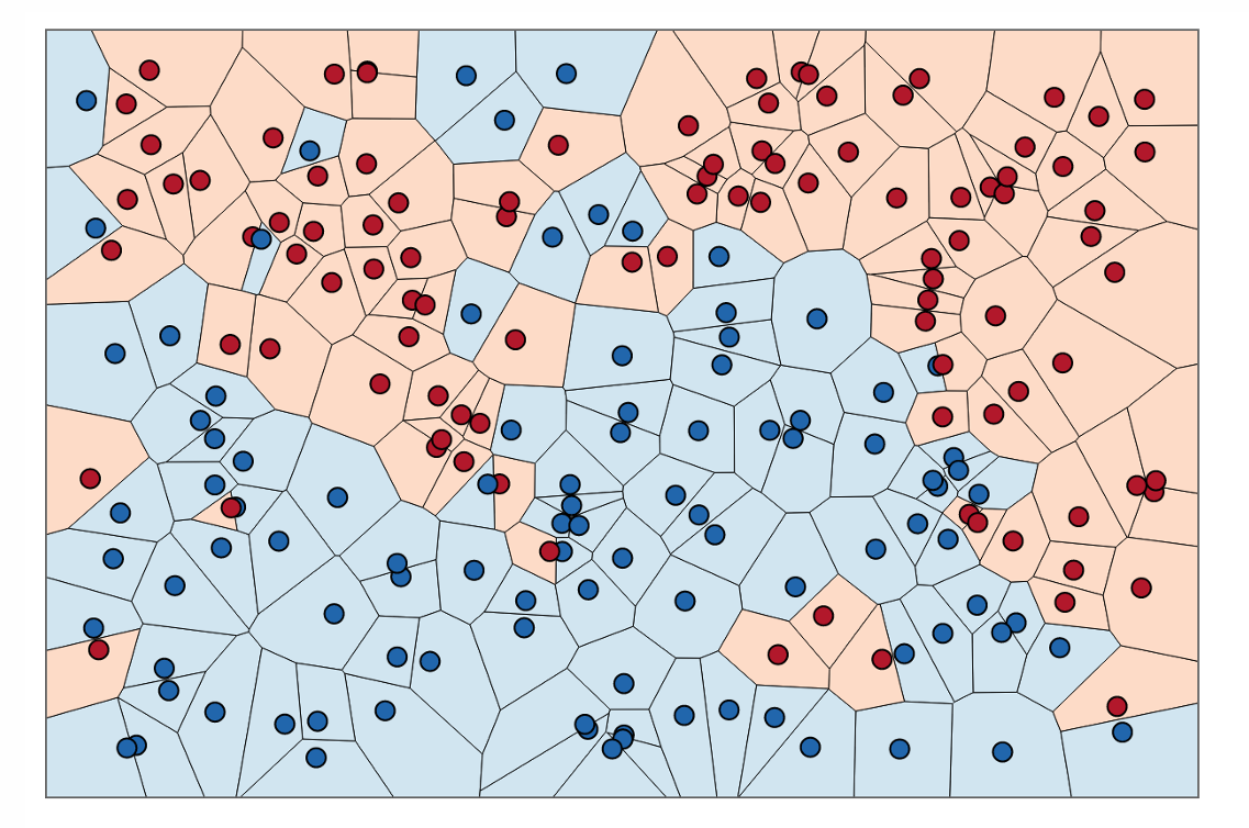 Voronoi图是一种将空间划分为多个区域的方法,每个区域由一个点(训练样本)定义,并且包含所有比任何其他点更接近该点的点。