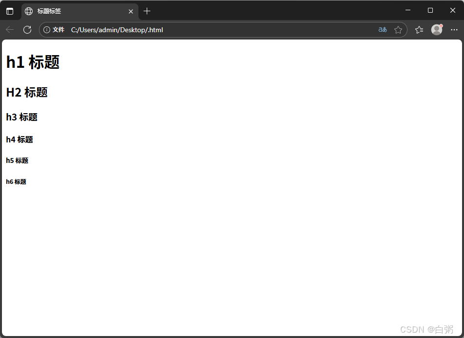 默认情况下,浏览器会以比普通文本更大和更粗的字体显示标题中的内容,使用<h1>标签定义的标题字体最大,而使用<h6>标签定义的标题字体最小,如下例所示: