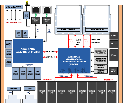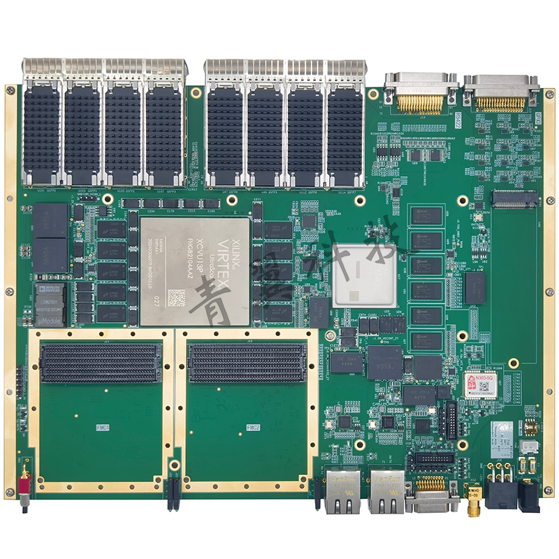 该平台的主处理器 VU13P 外挂两组 72 位 DDR4 SDRAM,来 实现超大容量数据缓存,外挂 2 个 FMC+ HPC 接口,支持 2 个 FMC+ 子卡的扩展,同时 VU13P 支持 8 路 100G 以太网光纤传输。