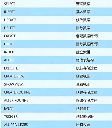 权限示例: SELECT, INSERT, UPDATE, DELETE, CREATE, DROP, ALTER, INDEX, EXECUTE, ALL