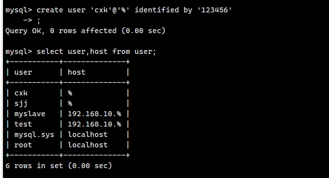 示例:create user 'cxk'@'192.168.10.%' identified by '123456';