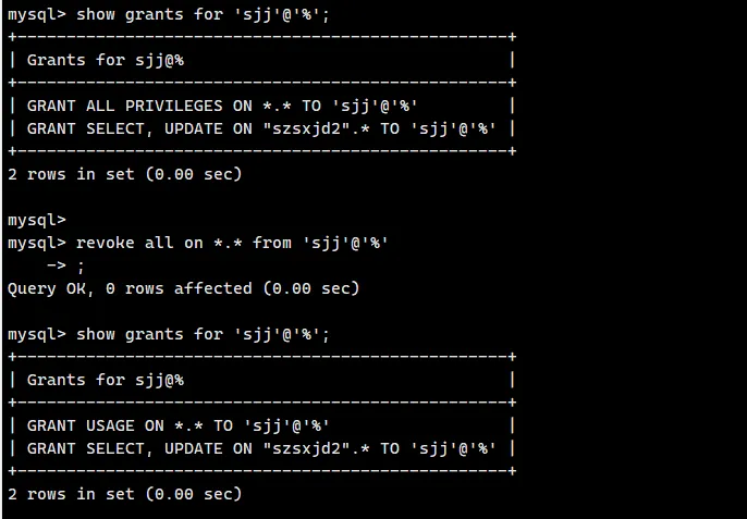 ● 全局级权限变为:GRANT USAGE ON . TO 'sjj'@'%'------USAGE是 MySQL 的 "空权限",表示该用户存在,但无任何全局权限(原有的ALL PRIVILEGES ON *.*已被彻底撤销);