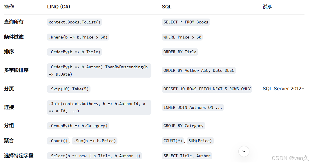 LINQ 与 SQL 语法对比表