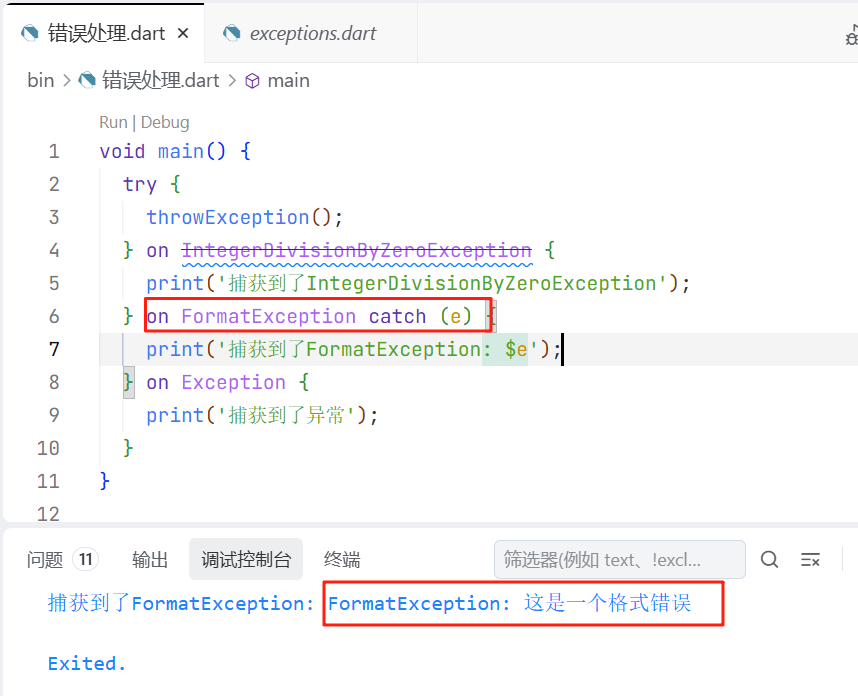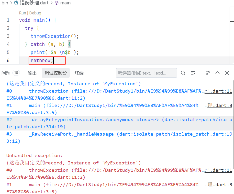 在上面的例子中,捕获异常后我们可以通过rethrow关键字选择继续向上抛出。