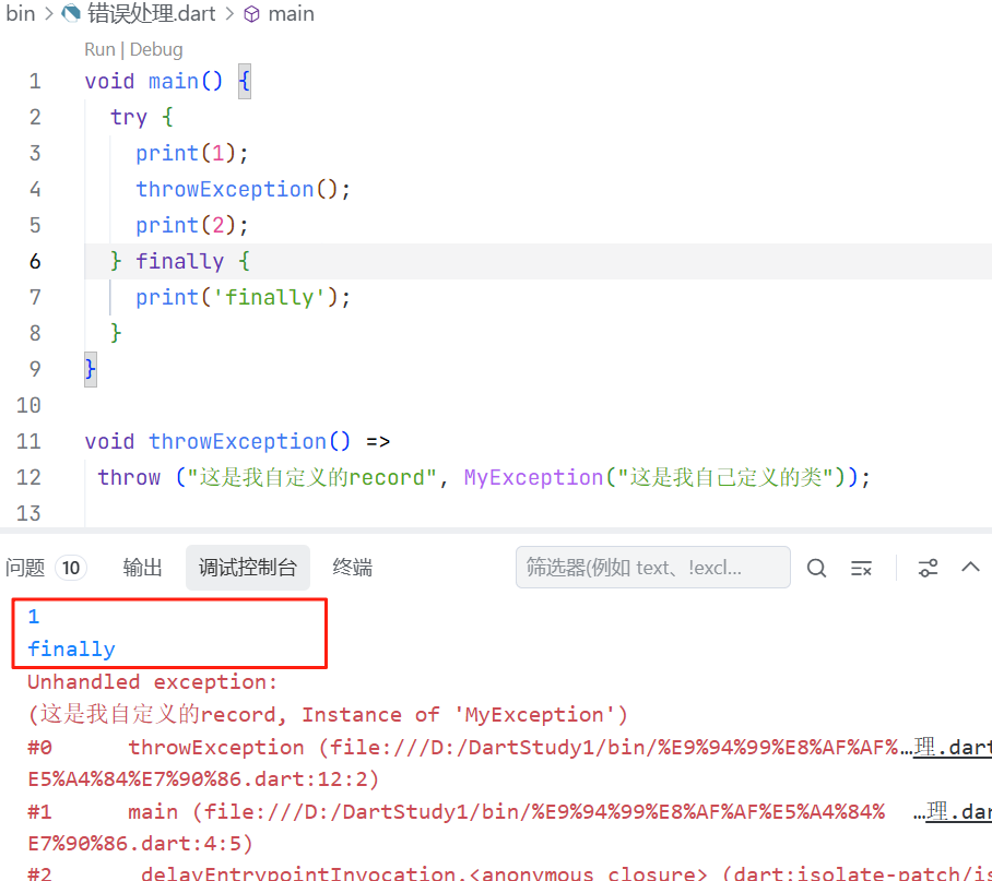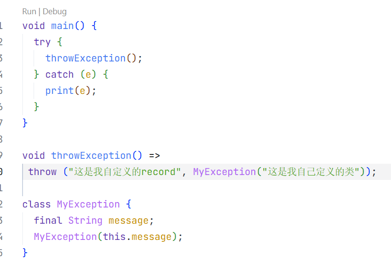 接下来我们尝试一下抛出任意非空对象,在下面的例子中,我自定义了一个类,并将throw使用record包裹