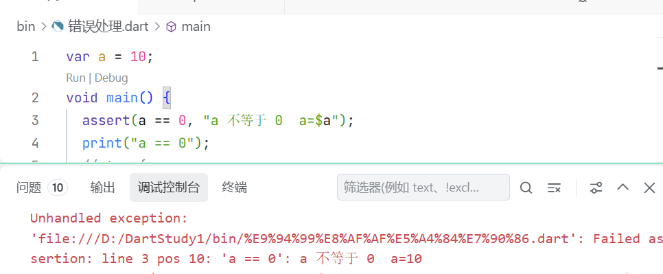 Your Dart code can throw and catch exceptions. Exceptions are errors indicating that something unexpected happened. If the exception isn't caught, the isolate that raised the exception is suspended, and typically the isolate and its program are terminated.