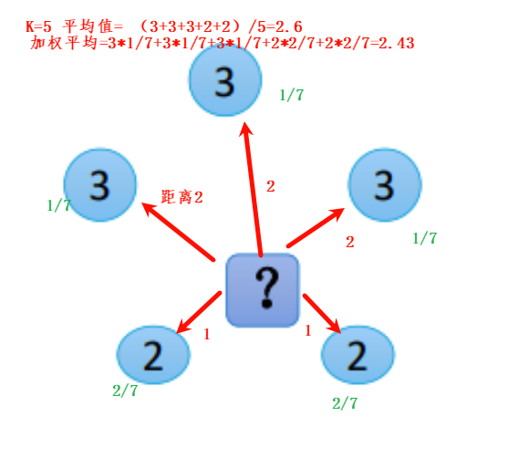 - 加权平均值法:每个邻近样本的权重是不一样的,一般情况下 采用权重和距离成反比的方式来计算,也就是说在计算均值的时候进行加权操作;