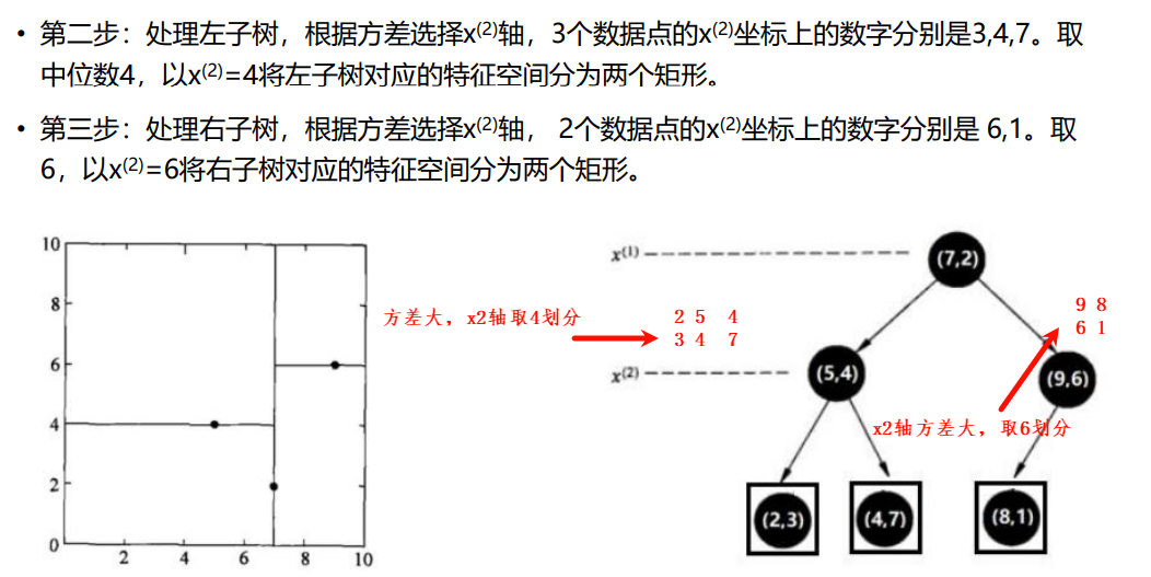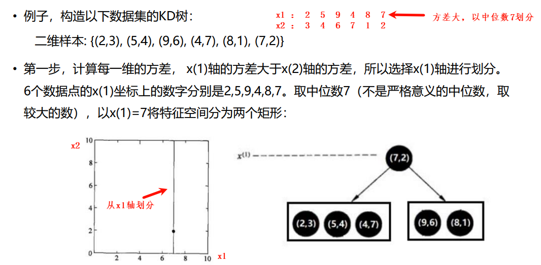 KD树采用从m个样本的n维特征中,分别计算n个特征取值的方差,用方差最大的第k维特征nk作为根节点。对于这个特征,选择取值的中位数nkv作为样本的划分点,对于小于该值的样本划分到左子树,对于大于该值的样本划分到右子树,该值为根节点。接下来对左右子树采用同样的方式找方差最大的特征作为根节点,递归即可产生 KD树。