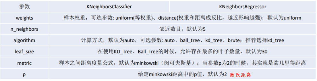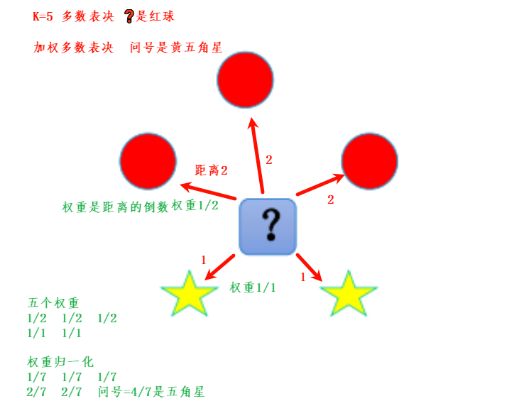 - 加权多数表决法:每个邻近样本的权重是不一样的,一般情况下采用权重和距离成反比的方式来计算,也就是说最终预测结果是出现权重最大的那个类别;