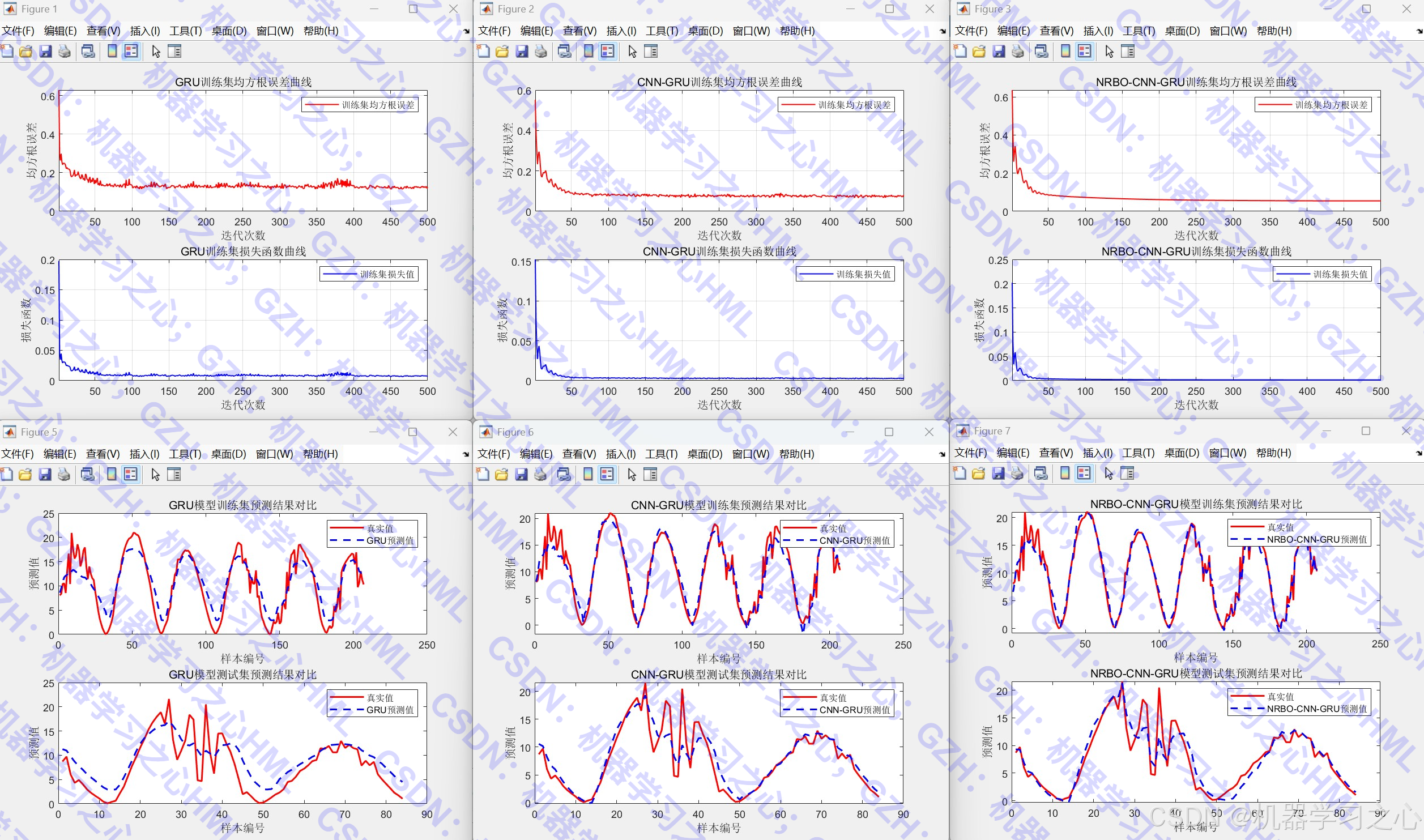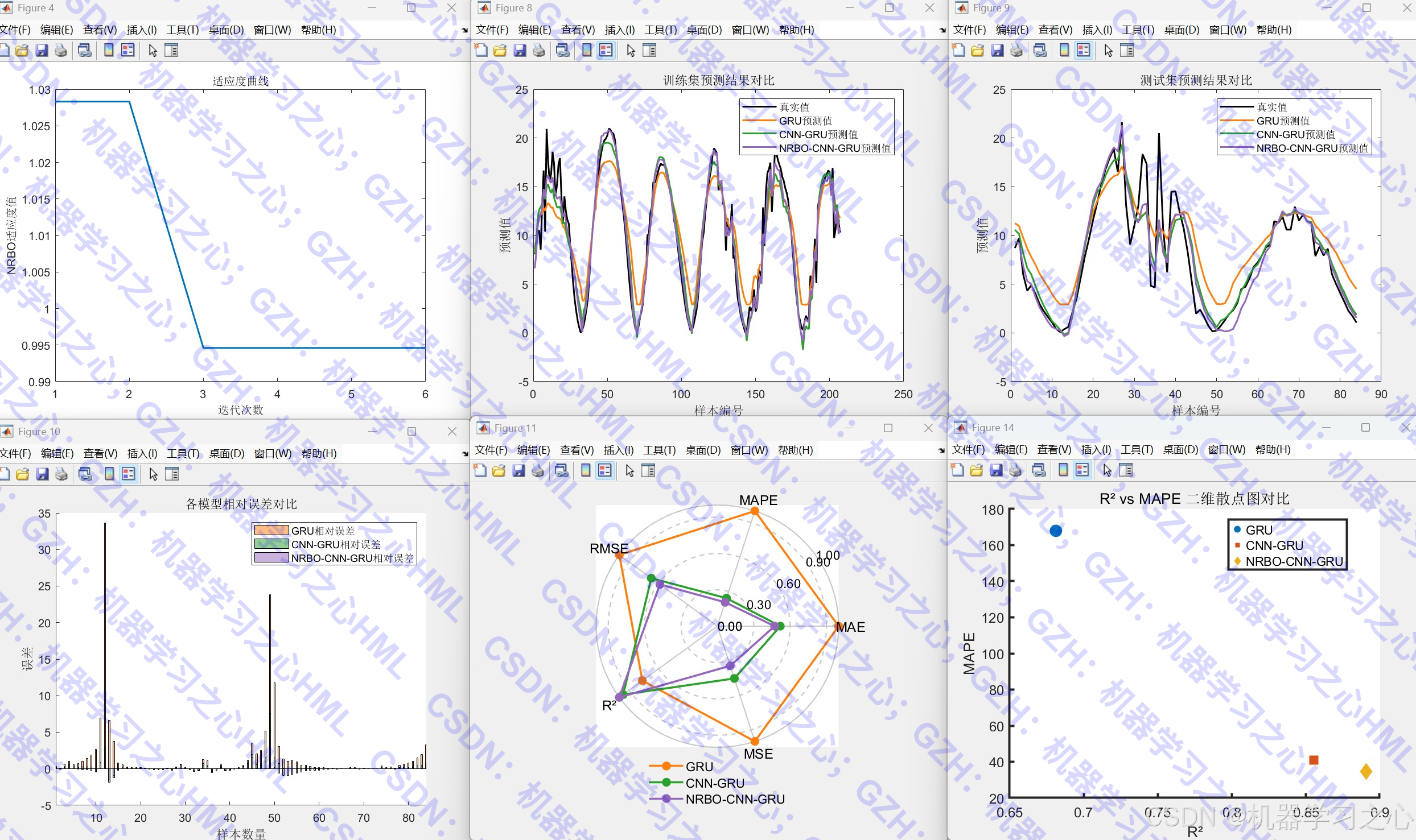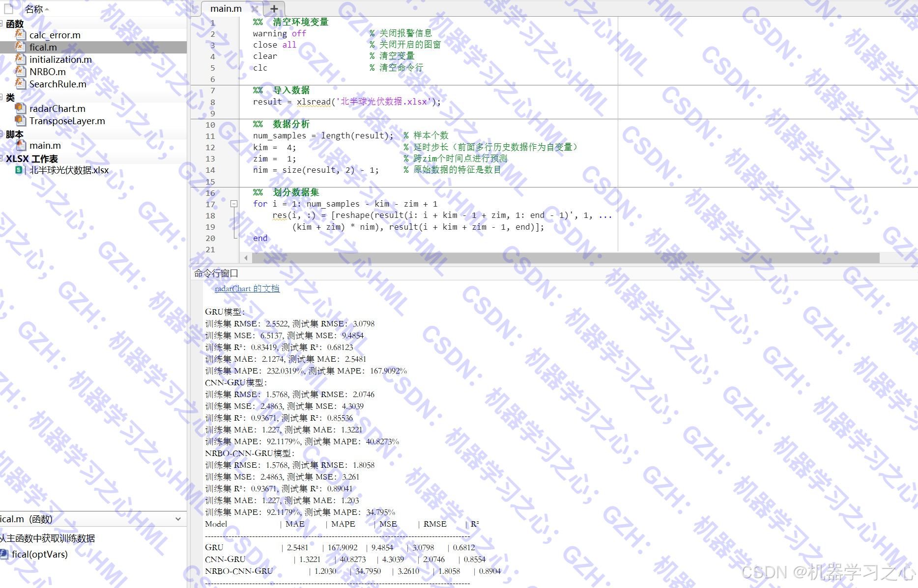 该代码实现了一个光伏功率预测,使用三种深度学习模型(GRU、CNN-GRU、NRBO-CNN-GRU)对北半球光伏数据进行时间序列预测。核心功能包括: