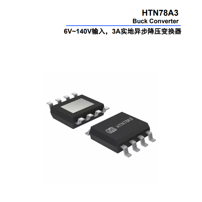 先看HTN78A3的核心硬件参数,这是它实现高效降压的基础。它的输出电流规格为3A,能够满足大多数中低功率负载的供电需求,像车载导航、工业传感器等常见设备都能适配。更值得一提的是,它内置了一颗250mΩ的高侧功率管(MOSFET),这种集成设计省去了用户外接功率管的麻烦,不仅简化了电路布局,还能减少外接元件带来的损耗,从源头提升了转换效率。而最突出的优势当属其宽输入电压范围------6V到140V,这个范围几乎覆盖了从低压适配器到高压电池组的绝大多数输入场景,无论是6V的小型电源还是140V的工业高压输入,它都能稳定工作,无需额外设计电压适配电路,大大降低了应用门槛。