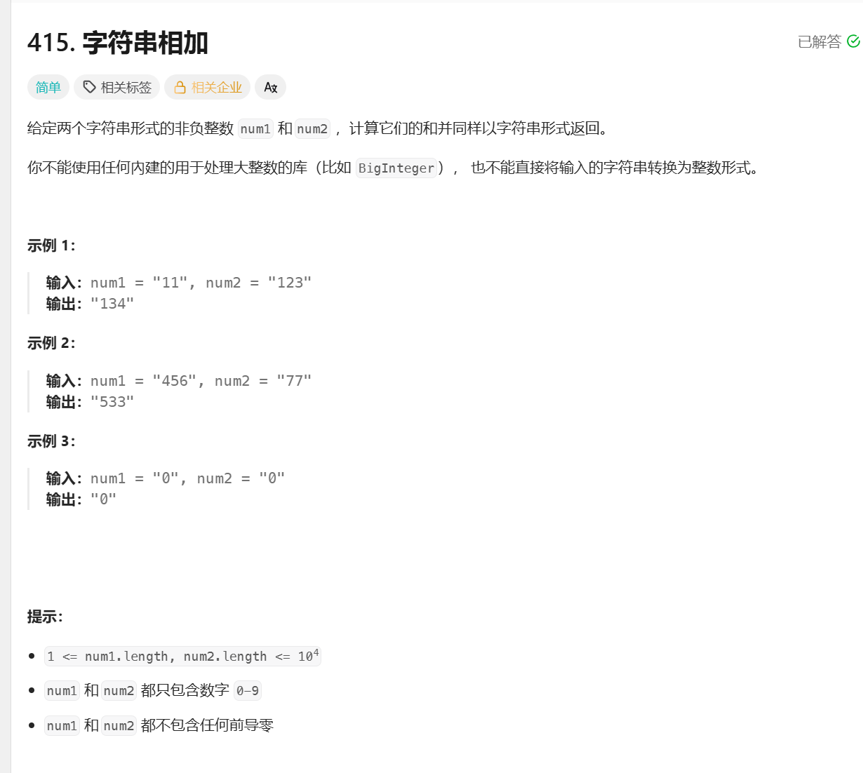 我们定义两个指针 i 和 j 分别指向 num 1 和 num 2 的末尾,即最低位,同时定义一个变量 add 维护当前是否有进位,然后从末尾到开头逐位相加即可。你可能会想两个数字位数不同怎么处理,这里我们统一在指针当前下标处于负数的时候返回 0,等价于对位数较短的数字进行了补零操作,这样就可以除去两个数字位数不同情况的处理,