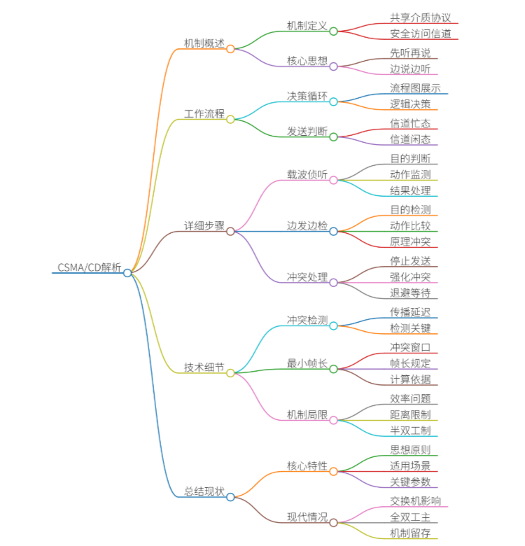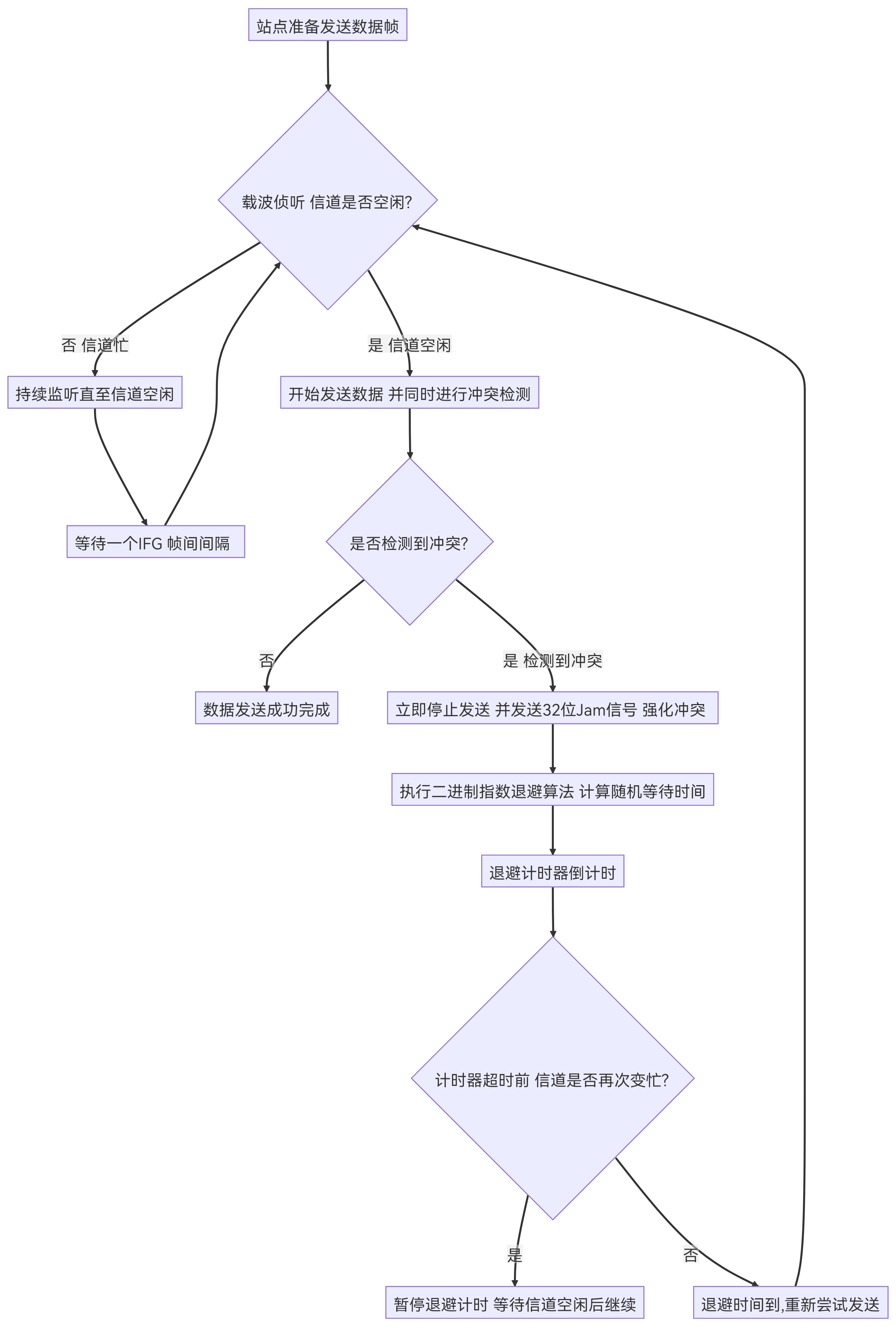 CSMA/CD的工作机制可以看作一个严谨的决策循环,其其完整的工作流程与决策逻辑如下: