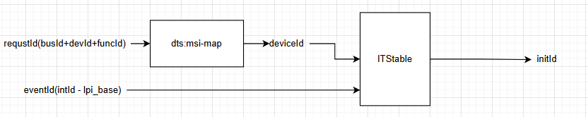 我们看一先requestId eventId和initId的关系,对于pcie来说requtestId是固定的,我们会通过RC dts节点里的msi-map将他map成一个deviceId,一般都是一一映射,然后用deviceId和eventId在ITS table里创建一个到InitId的映射,这个initId就是GIV-V3的LPI中断。我们给设备分配eventId时会配置成initId - lpi_base。lpi_base是分配给设备专用的。这样设备发出一个msi就会由一个对应initId由ITS发给GIV-V3的redistributor。